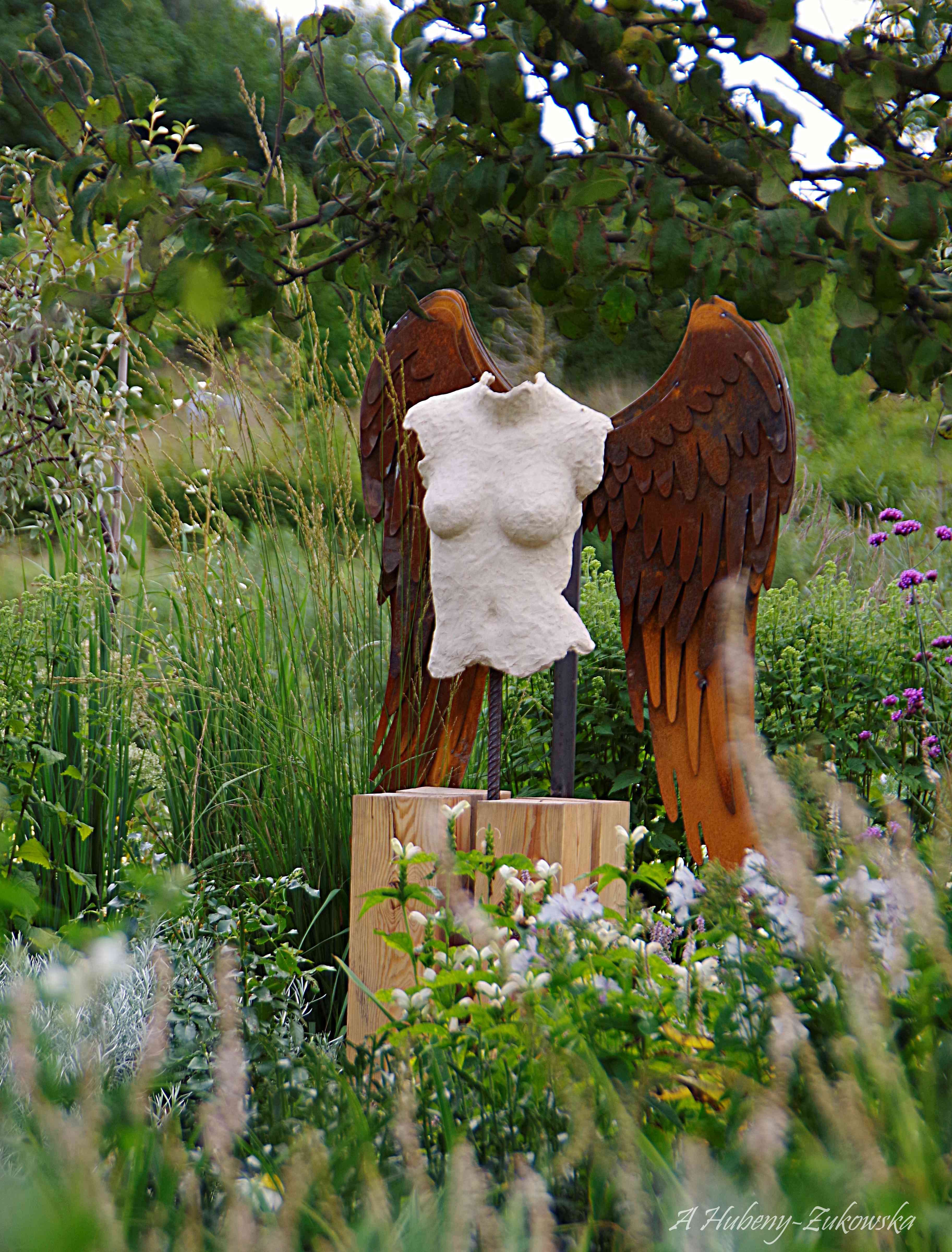 Przestrzeń wokół domu składa się z kilku wnętrz ogrodowych różnej wielkości. Biały ogród to geometryczne wnętrze na planie prostokąta, które wypełnione jest swobodnymi nasadzeniami mieszanymi w stylu angielskim. Choć jest niewielkie to znajdziecie tu kilkaset gatunków i odmian drzew, krzewów i bylin. Projekt jest częścią mojej pracy doktorskiej: Ogrody przydomowe istotnym elementem zielonej infrastruktury miasta czy raczej miejscem ekspresji ich twórców? Rzeźba anioła / duszy, która zajmuje ważne miejsce w ogrodzie została zauważona na London International Creative Competition 2020.